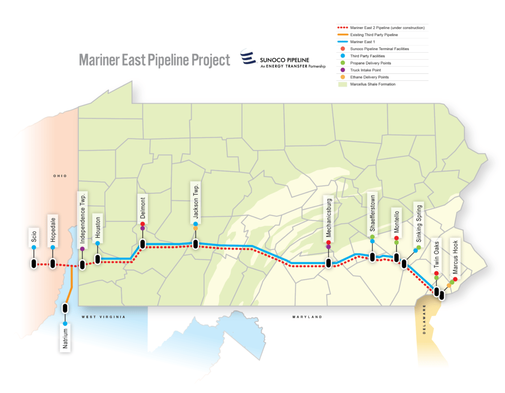 Following almost the exact same right-of-way as the existing Mariner East 1, this “hybrid” pipeline is confusingly also called Mariner East 2, even though it is a distinct piece of infrastructure from the new 20″ pipeline being built.