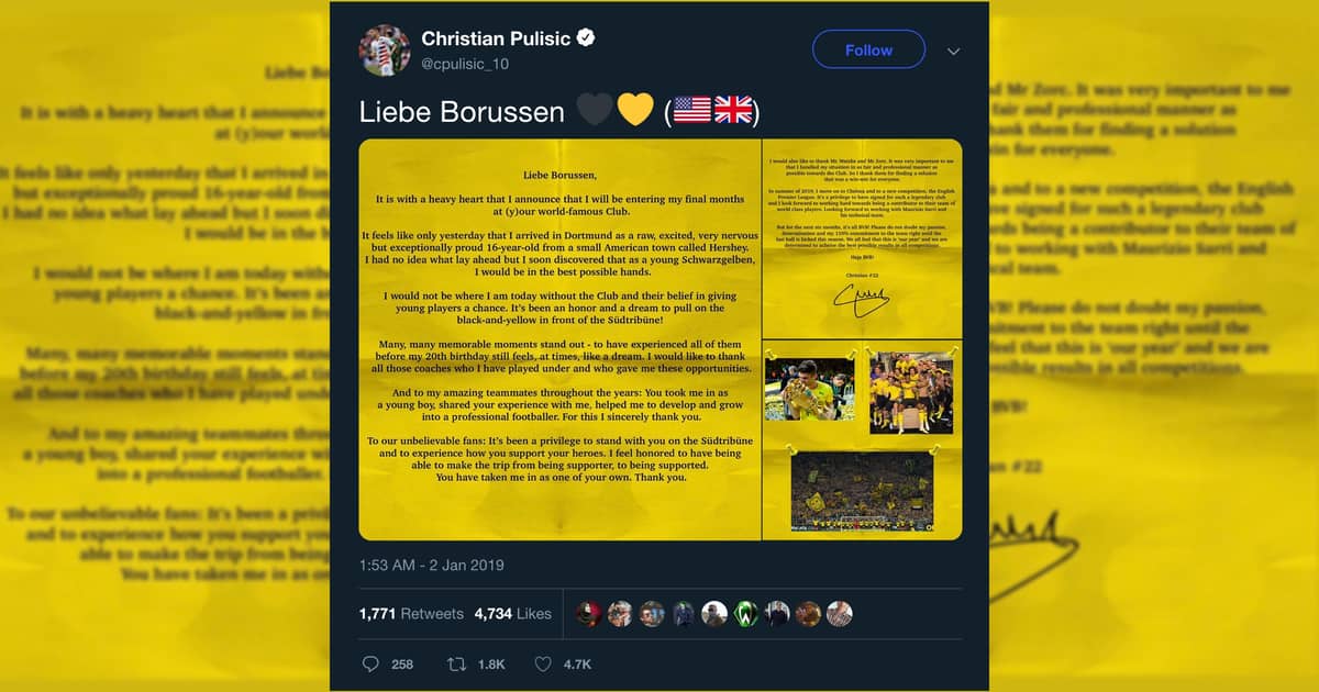 Christian Pulisic confirmed today that he would be leaving Borussia Dortmund this summer to join Chelsea FC in the Premiere League.