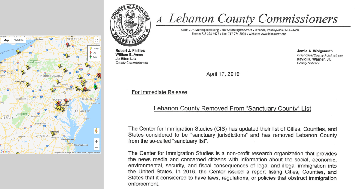 The Center for Immigration Studies (CIS) updated its list of sanctuary cities, counties, and states this week, removing Lebanon County in what the County Commissioners have called a correction of a designation that they say should never have been given in the first place.