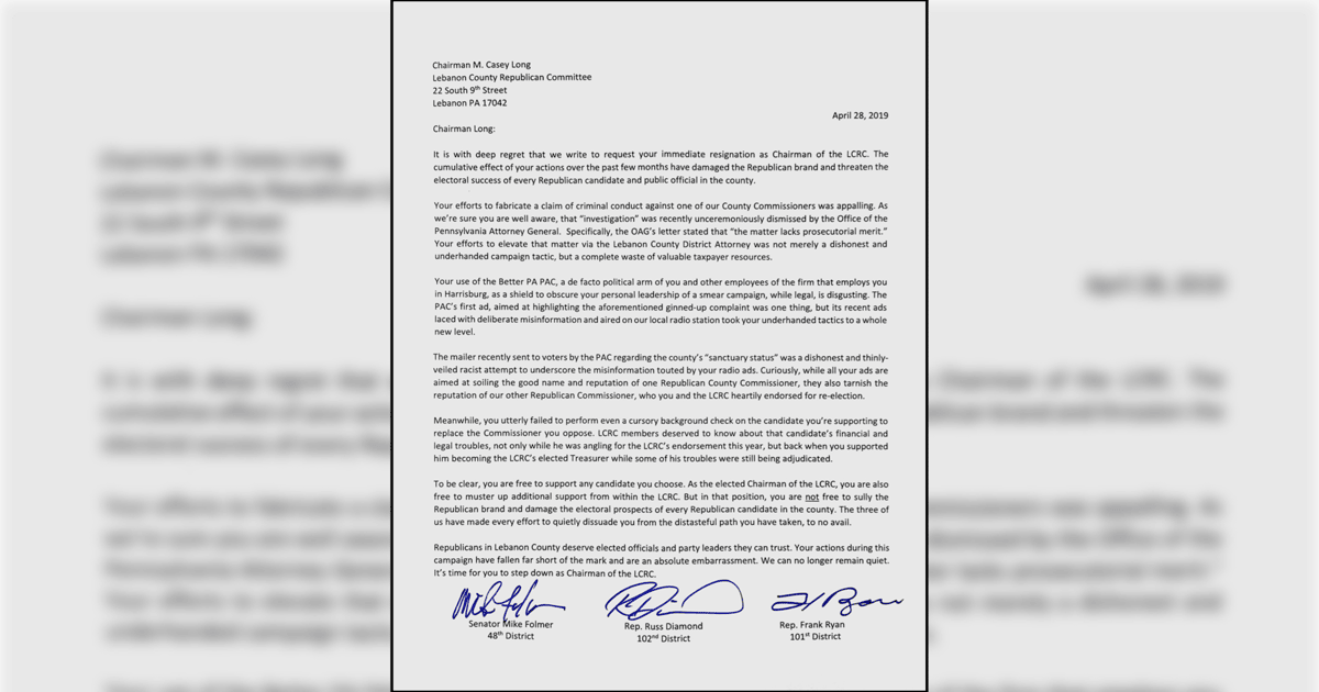 Republican legislators are calling for the resignation of Lebanon County Republican Committee Chairman Casey Long.