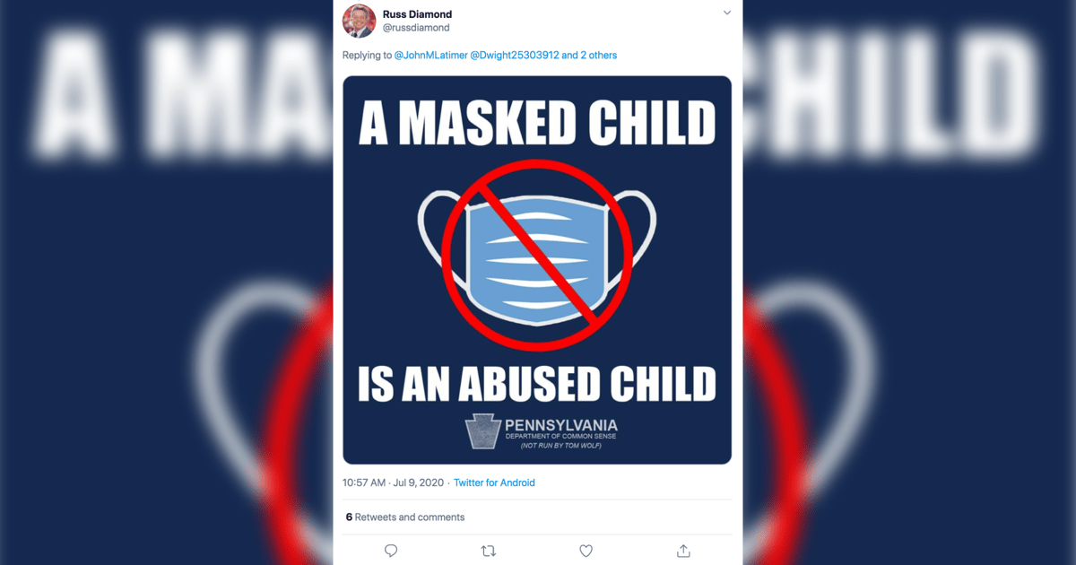 El representante estatal Russ Diamond tuiteó un meme el jueves 9 de julio, equiparando el uso de una máscara por un niño a un acto de abuso infantil.