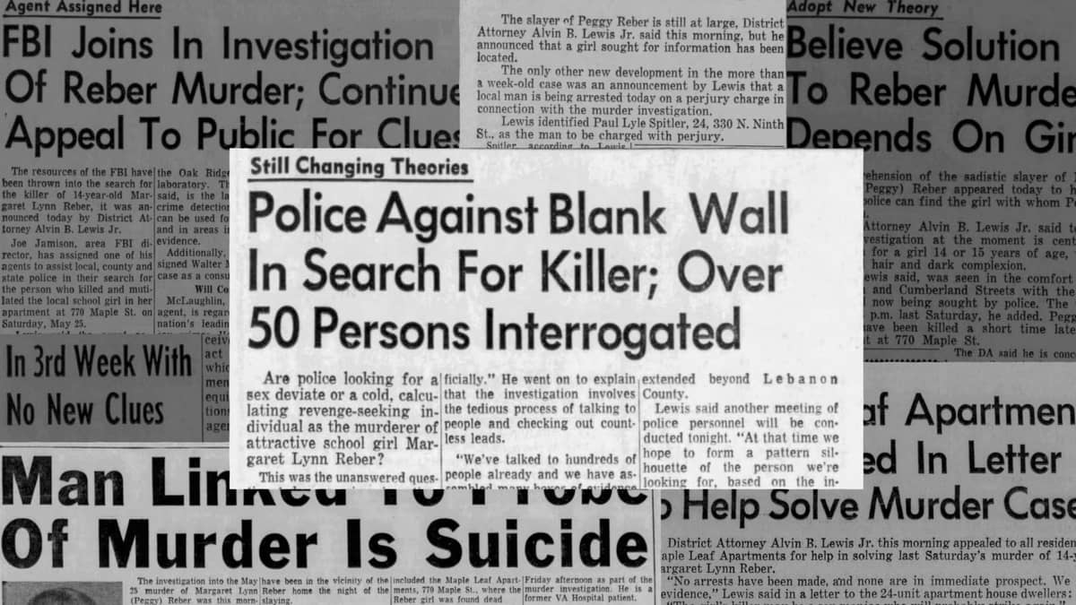 According to a timeline published by the Lebanon Daily News in May 2018, Mary Reber found her daughter’s “dead and mutilated body” when she returned home at about 3:30 a.m. on May 26, 1968. On May 29 of that year, the day of Peggy’s funeral, Assistant District Attorney George Christianson said there were at least 12 male suspects under investigation.