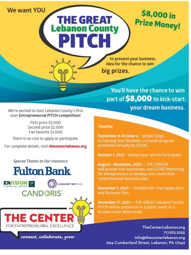 THE CENTER for Entrepreneurial Excellence, a free business resource for Lebanon County, is hosting the first-ever Entrepreneurial PITCH competition, titled “THE Great Lebanon County PITCH” to win $8000 in start up funds.
