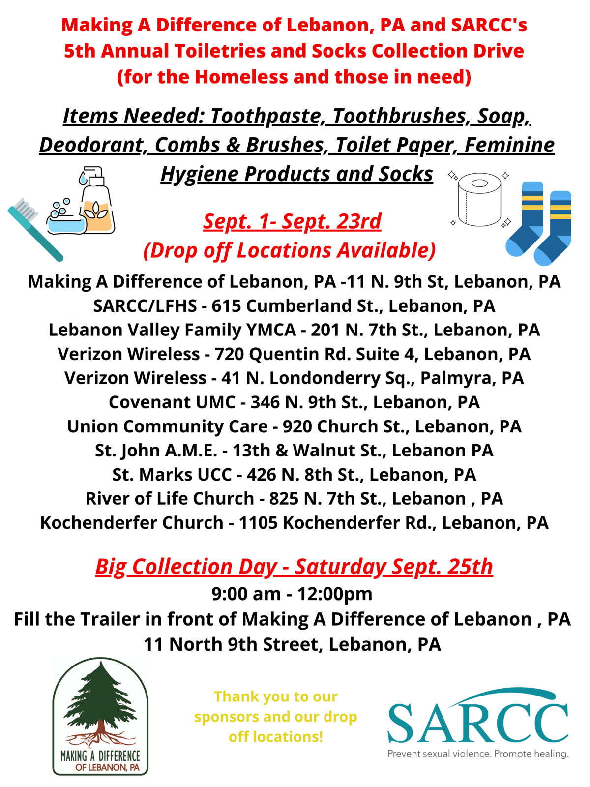 Making A Difference of Lebanon, PA and SARCC 5th Annual Collection Drive for those in need or homeless.