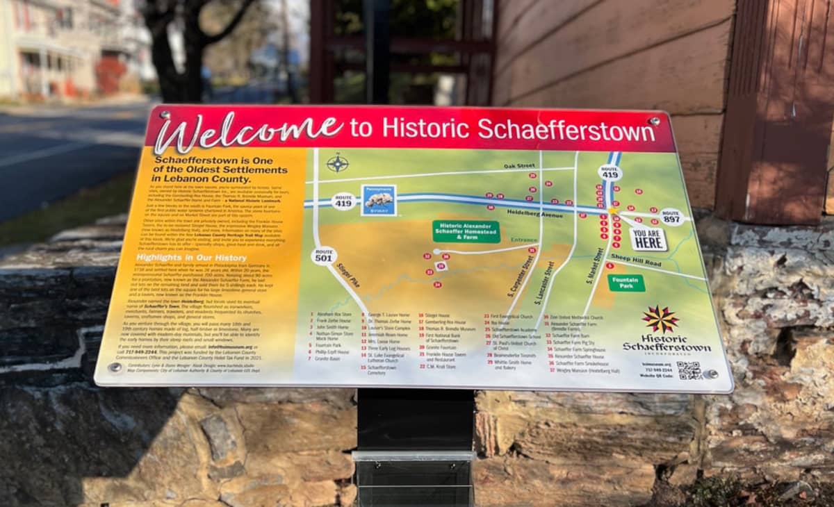 The 36″ by 24″ full color map display identifies three dozen sites as well as the Route 419 Scenic Byway which passes through the village. A brief history of Schaefferstown is included as well. A QR code in the lower right hand corner offers instant access to the Historic Schaefferstown website.
