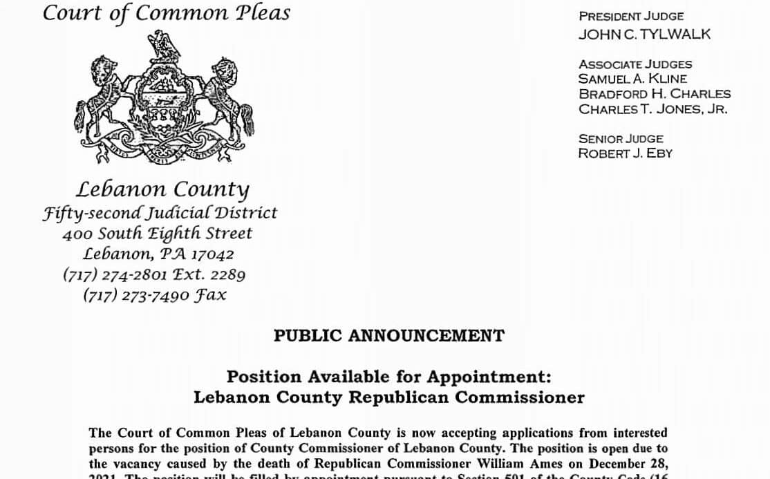 Pennsylvania law requires the court to pick a successor of the same party to complete Ames’ term, which expires in January 2024.