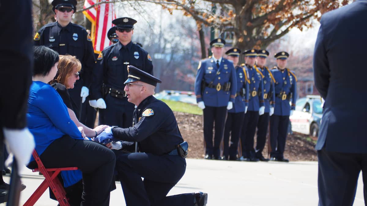 Lebanon police Chief Todd Breiner then knelt before Lora Lebo and presented it to her as officers stood at attention.