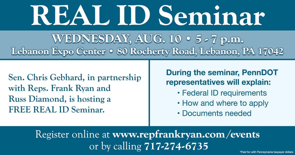 State Reps. Frank Ryan and Russ Diamond and Sen. Chris Gebhard will hold a REAL ID seminar in Lebanon to inform constituents about the REAL ID law and the process for obtaining a REAL ID before next spring.
