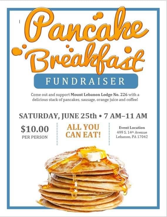 Mount Lebanon Lodge #226 will be hosting a pancake breakfast fundraiser to benefit the lodge on Saturday, June 25, 2022 from 7:00 a.m. through 11:00 a.m.