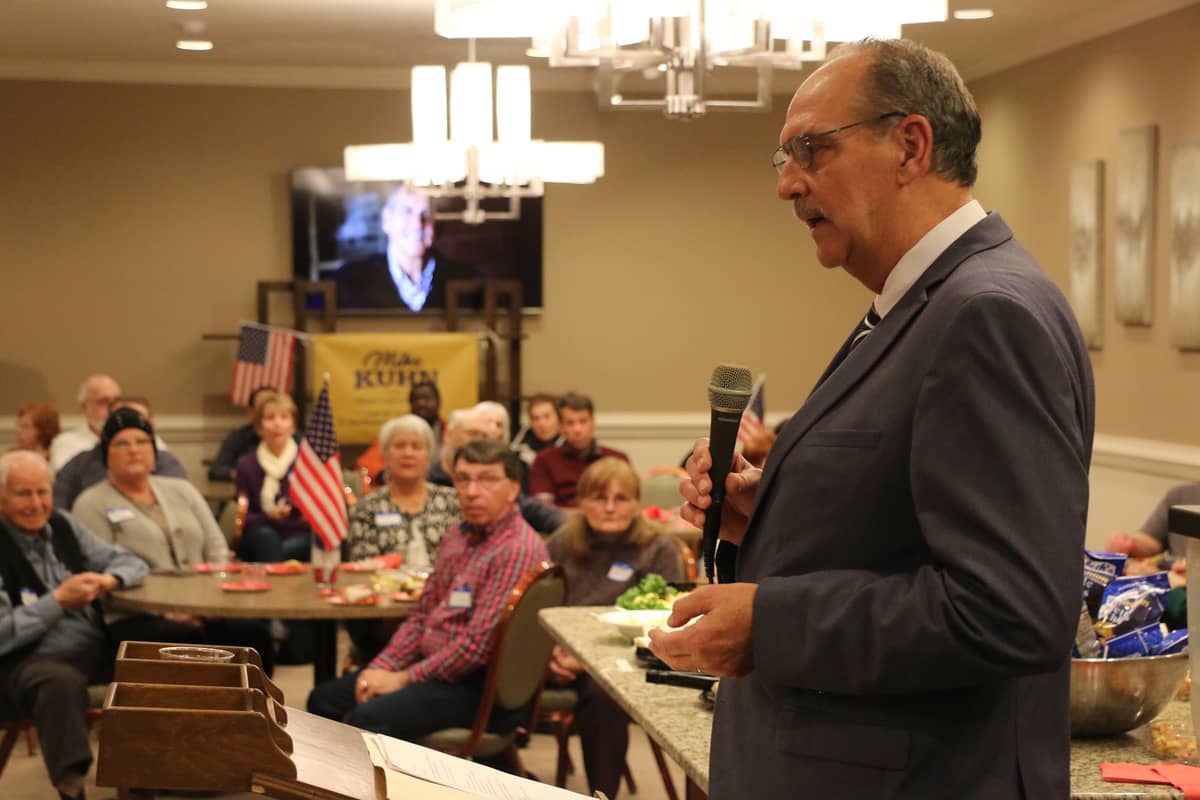 At his first-ever campaign event in a bid for elected office, Mike Kuhn addressed the question that was on everyone’s mind: why is it being held in a reception room of a funeral home?