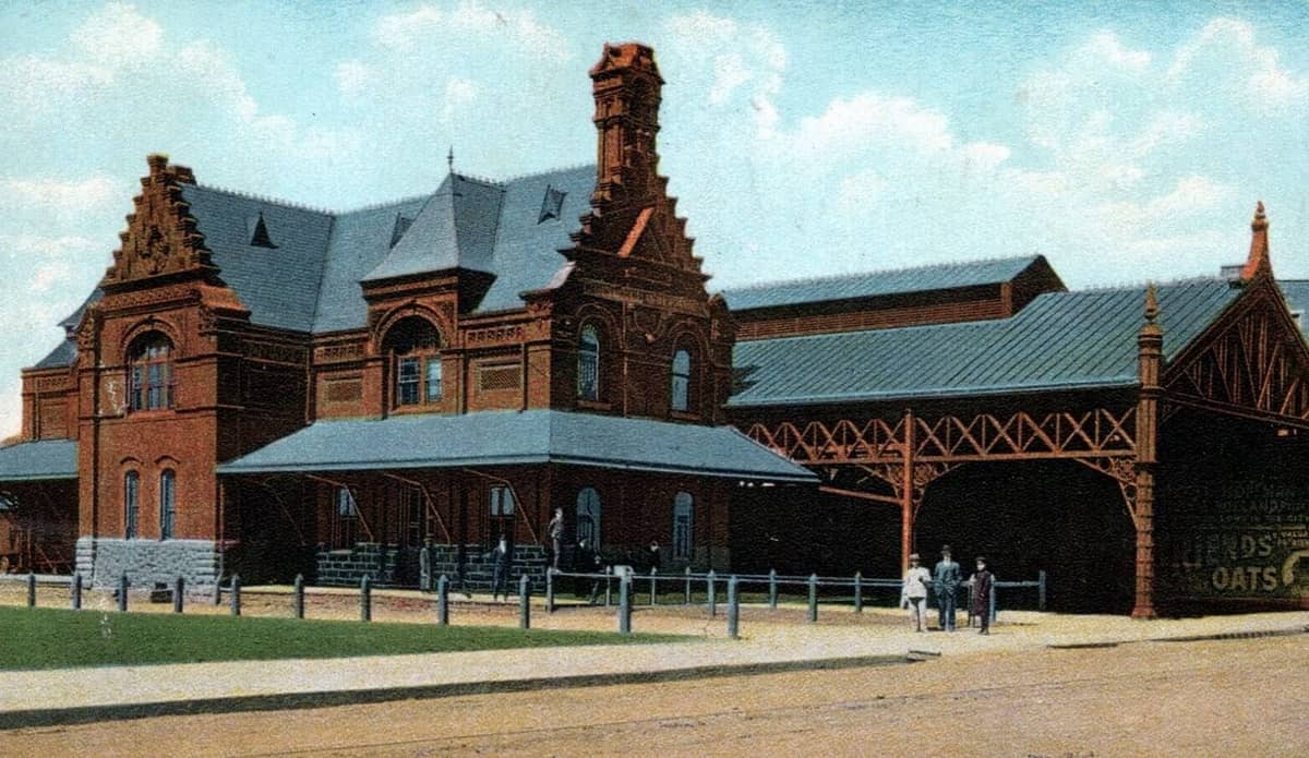 The station building was constructed with brick, slate, architectural terracotta (a form of masonry made from molded clay), and detailed with brownstone.