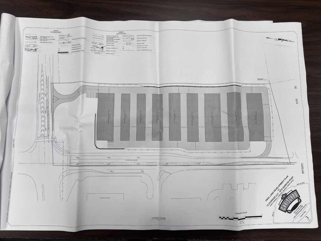 According to the plan, the 72 Storage facility will be accessible only from Rocherty Road. The planned facility consists of nine separate storage structures with a total of 67,025 square feet.