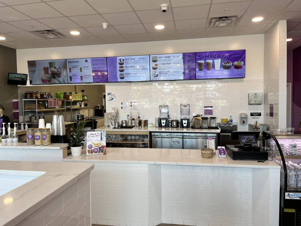 They offer dine in, takeout, and drive-thru service. The menu includes acai and pitaya bowls, smoothies, bites, and coffee. They also have a seasonal menu with seasonal fruits featured on the bowls.