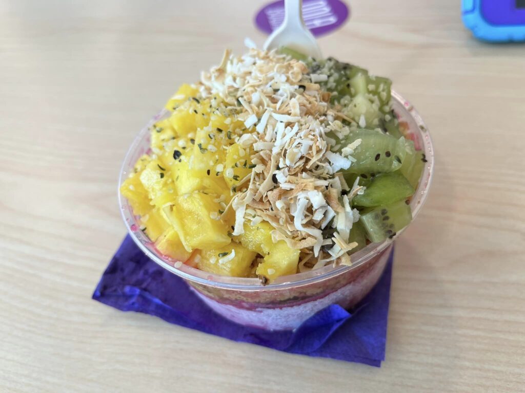 Our first selection today, we had a small Vibin’ Island ($10.95), with an Organic Pitaya Base, Honey, Paçoca, Pineapple, Kiwi, Toasted Coconut. The pitaya base came out a little frozen. The fresh fruit on top was plentiful. The toasted coconut flavor stood out through all bites. Unfortunately, the first few bites into this bowl we had the toppings fall onto the table and create a mess.