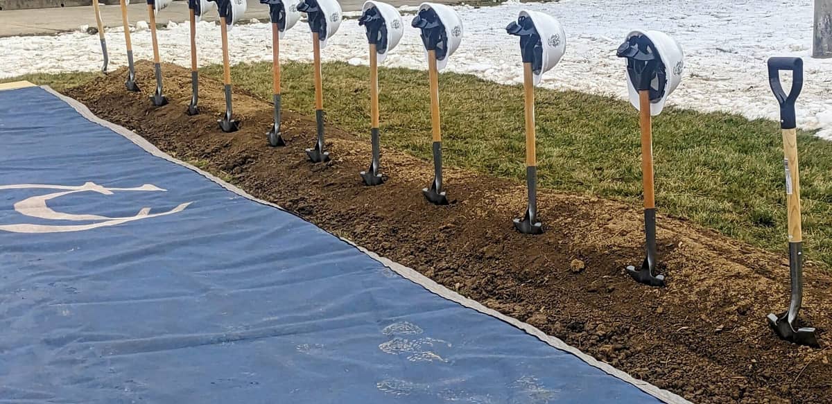 Administration project leaders, Beers + Hoffman representatives, and local representatives shovel up dirt at the groundbreaking ceremony.