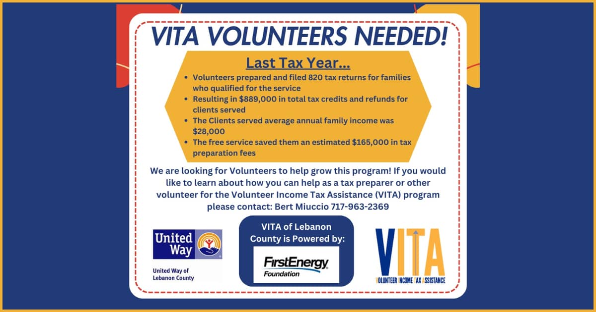 VITA is one of United Way of Lebanon County’s ongoing Signature Service Programs. It is sponsored again this year by the FirstEnergy Foundation and has made a significant impact on the local community over the years. However, additional volunteers are needed to expand its impact and meet the needs of the community.