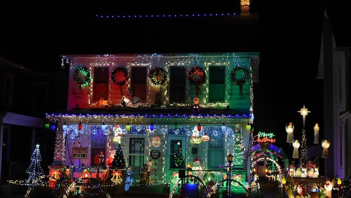 Darrel Moyer’s annual Christmas display features 210 blowmolds and over 20,000 lights, synchronized to music.