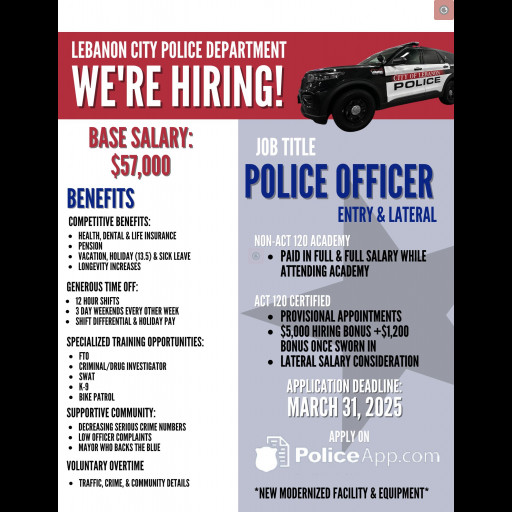 Lebanon City Police Department is now hiring – The Lebanon City Police Department is hiring full-time police officers. The Police Civil Service Commission is accepting applications until Monday, March 31. Mailed applications will not be accepted.