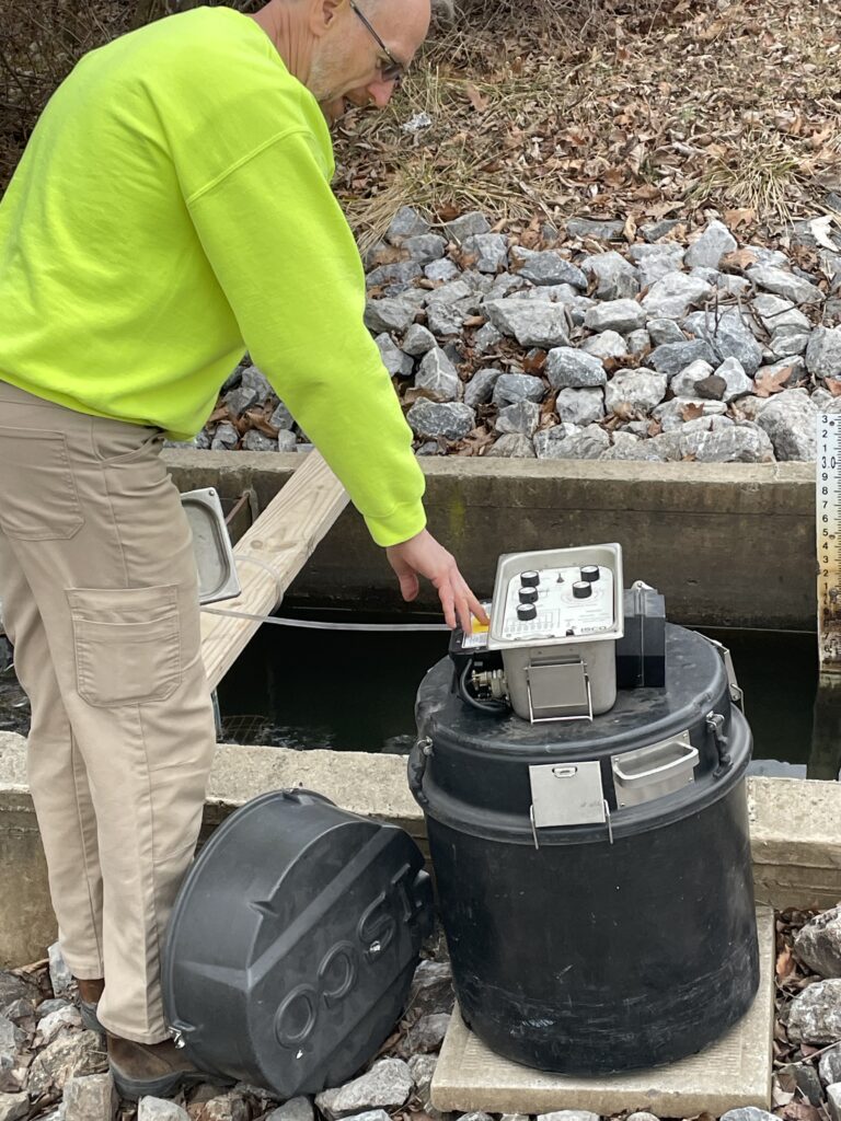 For 24 hours, the pump pulls in 500 milliliters of stream water every 20 minutes. Altogether, two gallons are collected for chemical analysis by a laboratory contracted by GLRA.