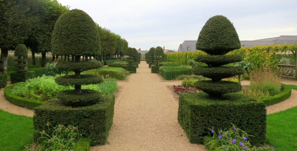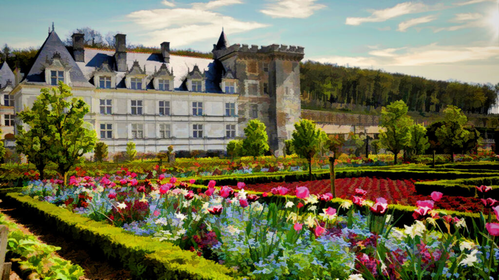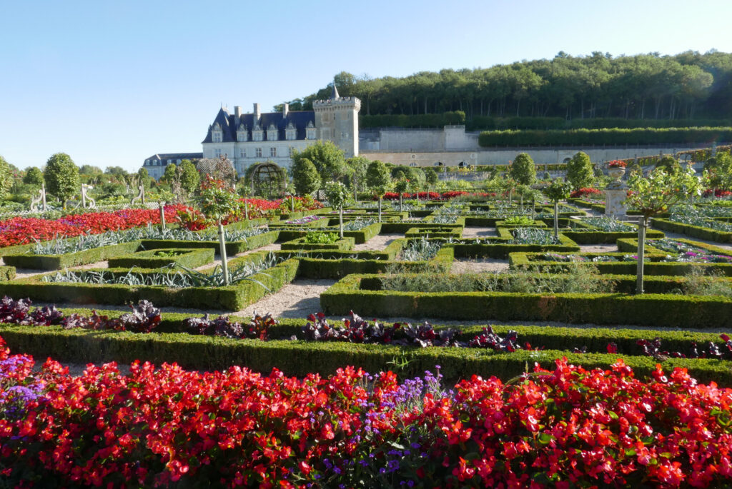 Villandry – its ancient form the castle Colombiers, built at the confluence of the Loire and Cher rivers, a region of good land, good forests, and good gardens. It became Villandry in 1639, nearly a century after its transformation into a modern, Renaissance-style châteaux under the ownership of Jean Le Breton, France’s Controller-General for War under King Francis I. (See here for a video which shows the evolution of Villandry from the Middle Ages to the Renaissance.)