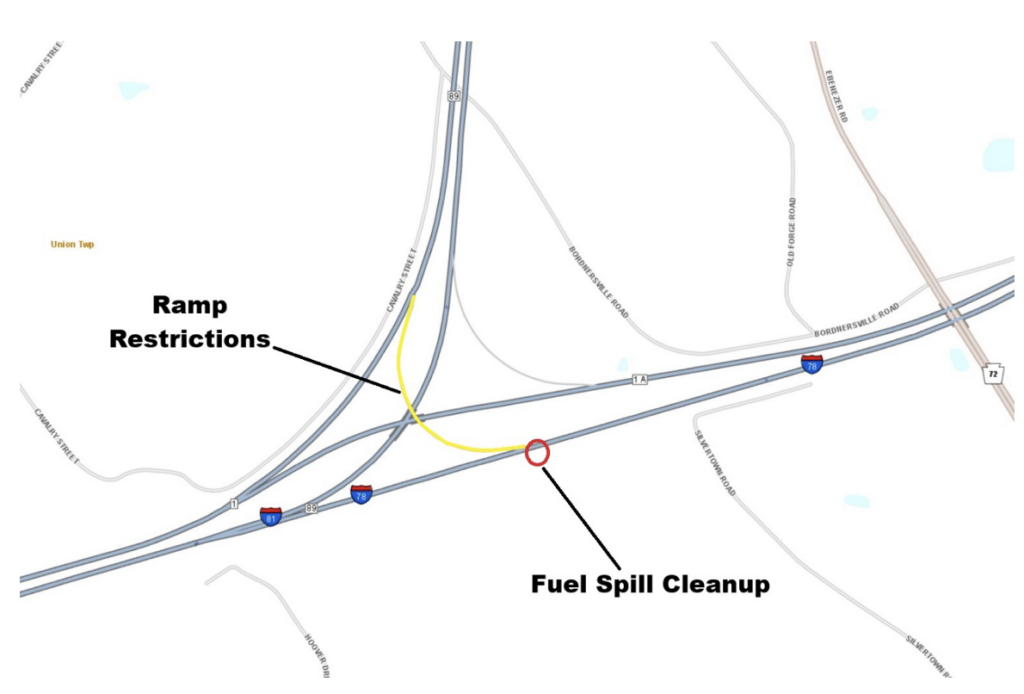 Weather permitting, this work will be performed from 9 a.m. to 3 p.m. During the work, the ramp lane from southbound I-81 to eastbound I-78 will be narrowed and the berm will be closed to make room for cleanup activities.