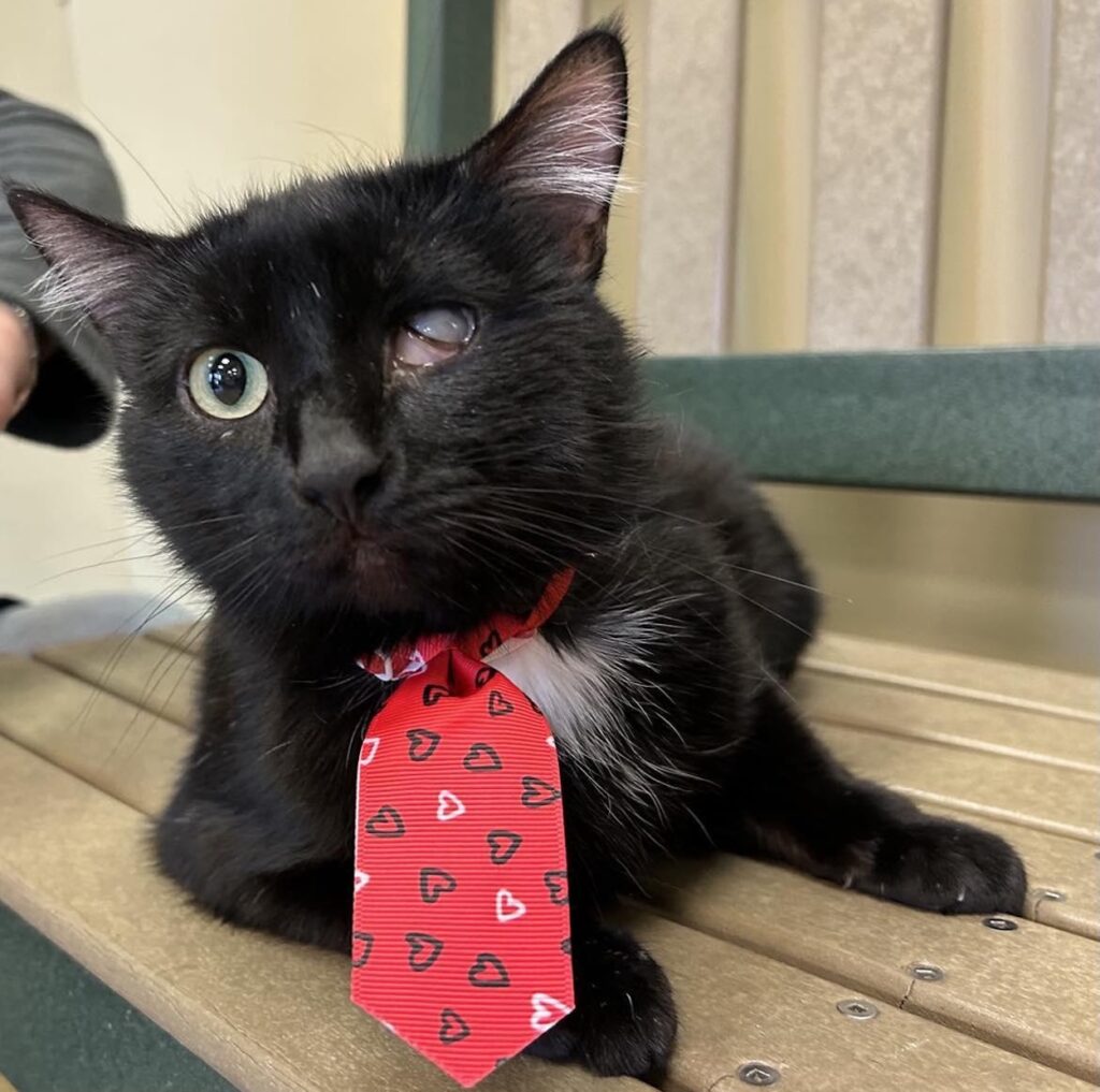 The shelter notes that Peanut is blind in his left eye. “It does not cause him any pain or irritation,” the rep says. “We hope an adopter can look past his little deformity and love him for who he is, a gentle and kind kitty!”