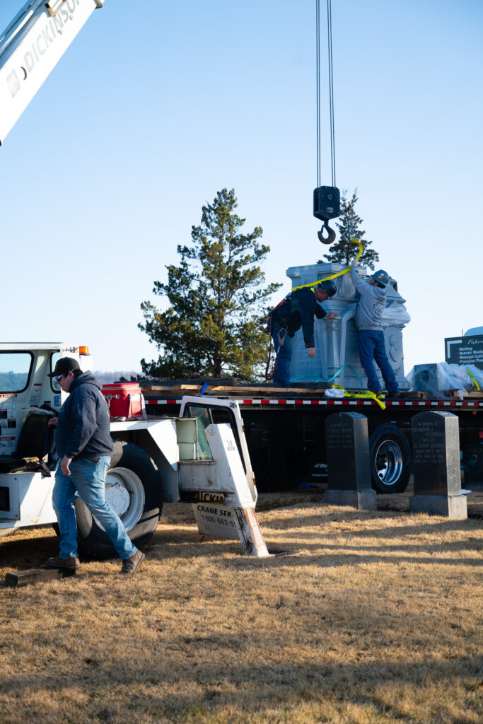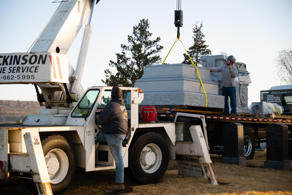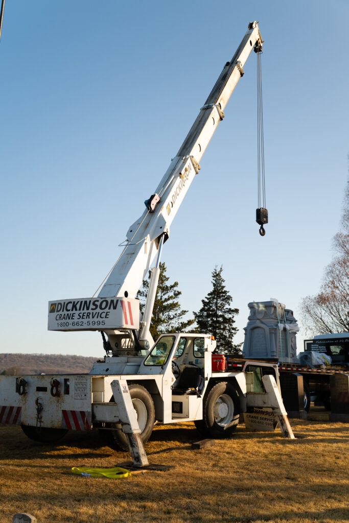 “He (Dickinson Crane owner) looked at it and said, ‘Yeah, we can do that.’” He also said, ‘And I would use so-and-so for riggers (C&D Rigging).’ So they got on the phone and got them out. And they said, ‘Sure, we can do this. No problem.’ Matter of fact, the rigging company to handle the monument bought all new rigging straps to ensure that they wouldn’t damage it. I can tell you those straps are a substantial expense.”