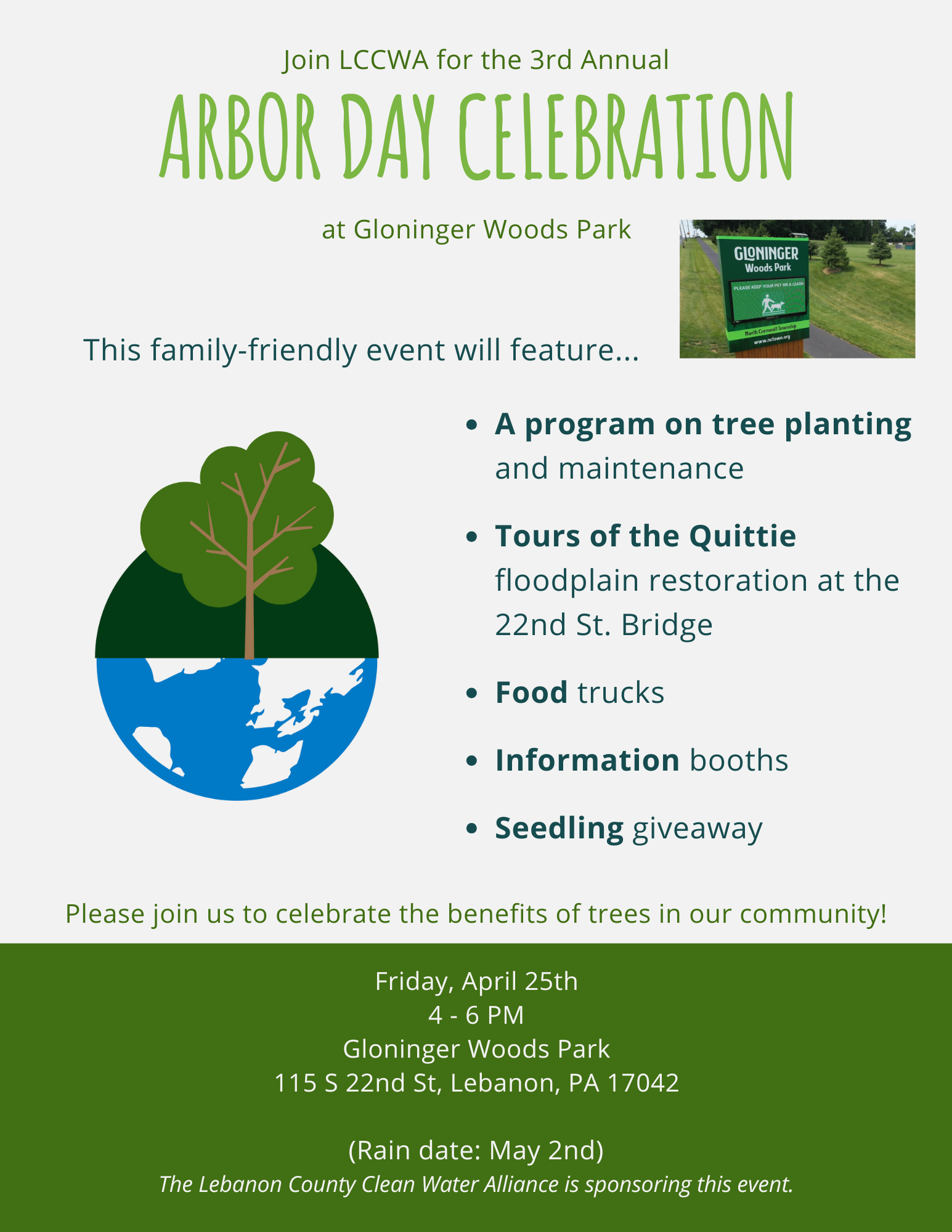 The third annual Lebanon County Arbor Day celebration will take place Friday, April 25, from 4 to 6 p.m. at Gloninger Woods Park, located at 115 S. 22nd Street.