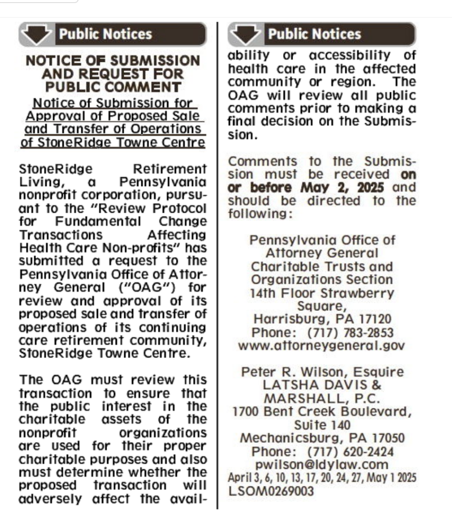 As is standard in the review protocol for fundamental change transactions affecting healthcare nonprofits, the Pennsylvania Office of Attorney General (OAG) is reviewing both transactions. According to a January 2025 letter sent to StoneRidge residents (PDF), the potential buyer for both homes is MDA Capital, owned by Akiva Glatzer and David Gamzeh of Priority Care Group. However, a spokesperson for the OAG said that Myerstown Nursing and Rehab is the potential operator of Town Centre. Department of State records indicate that Myerstown Nursing and Rehab was organized by Gamzeh.