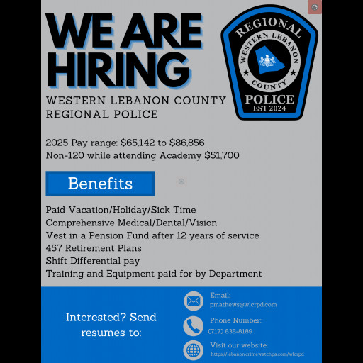Western Lebanon County Regional Police Department is hiring – The Western Lebanon County Regional Police Department is accepting applications from interested and qualified candidates for the position of police officer. Act 120 is preferred, but the police department does accept and participate in the academy process of pre-service applicants. The police department may consider pay enhancements for police officers who are certified or have prior experience.