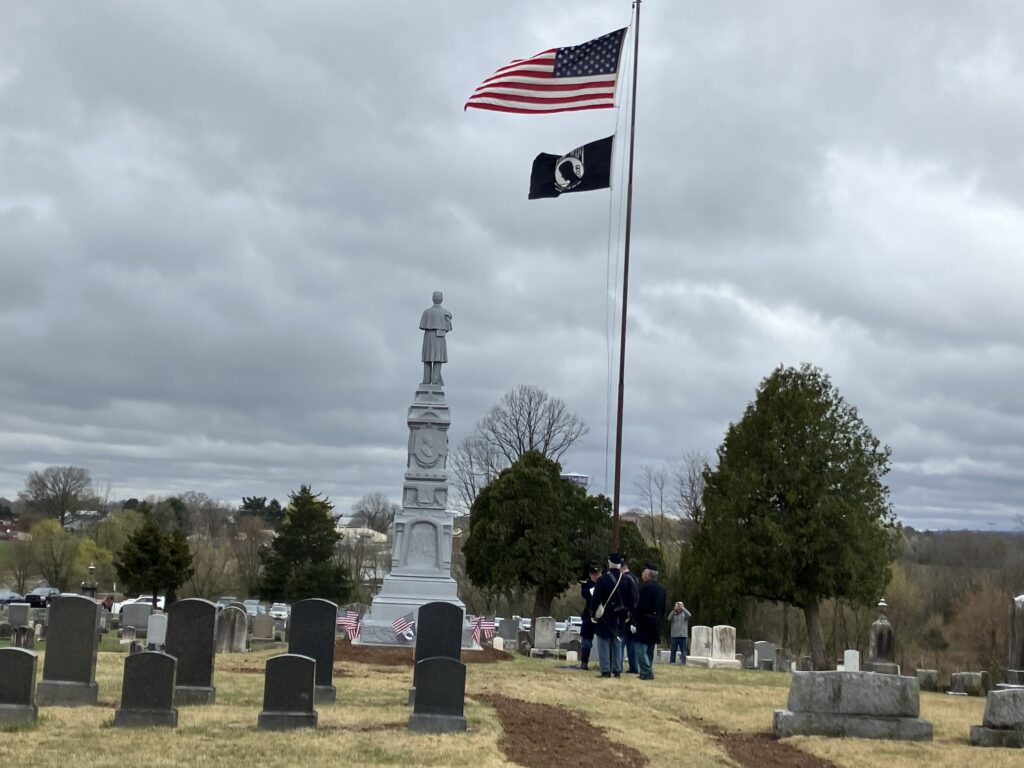 “Look at that figure, that sentry, he stands watch, eternally, vigilant over (the) Civil War veterans that are interred here at his feet. He’s not a commanding officer, he’s not a celebrated hero, but an enlisted man, a very embodiment of duty, unwavering commitment,” Phillips told the ensemble crowd during the ceremony on a cool spring afternoon under mostly cloudy skies. “He represents the countless soldiers who stood watch in the sun, in the wind, in the rain, in the snow, and the mud. So that others may be protected, he represents a man who marched into battle not seeking glory but fulfilling his obligation, represents that quiet courage of a common soldier.”