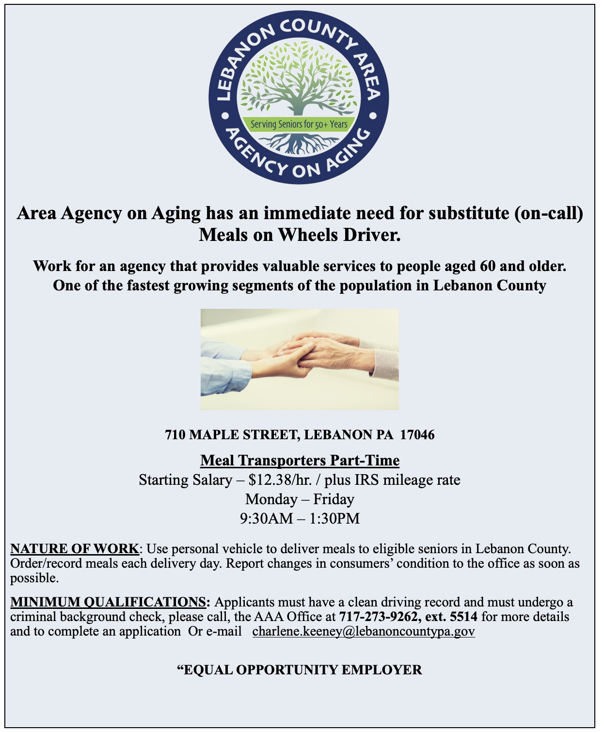 Minimum Qualifications: Applicants must have a clean driving record and must undergo a criminal background check, please call, the AAA Office at 717-273-9262, ext. 5514 for more details and to complete an application Or e-mail charlene.keeney@lebanoncountypa.gov.