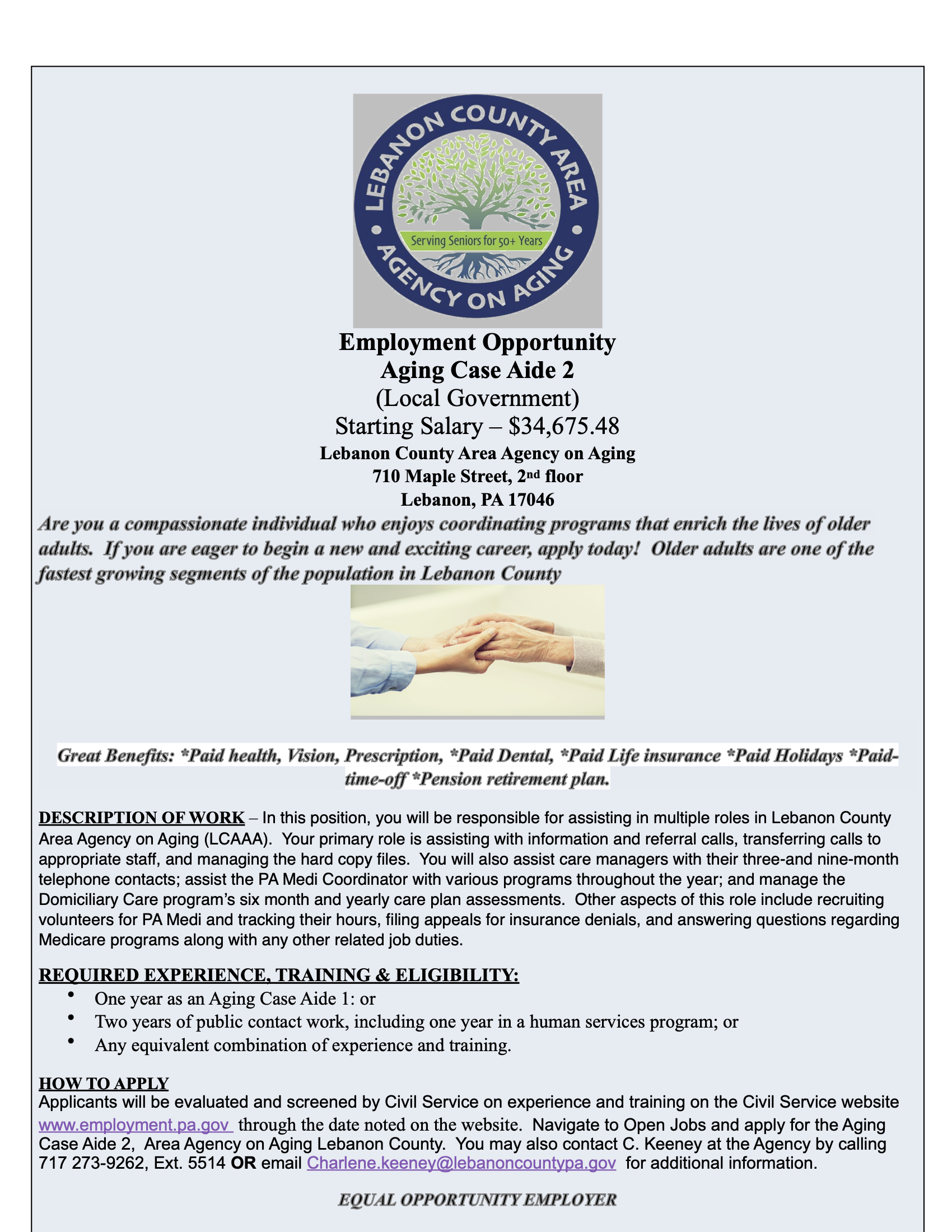 Work for an agency that provides valuable services to people aged 60 and older – one of the fastest growing segments of the population in Lebanon County.