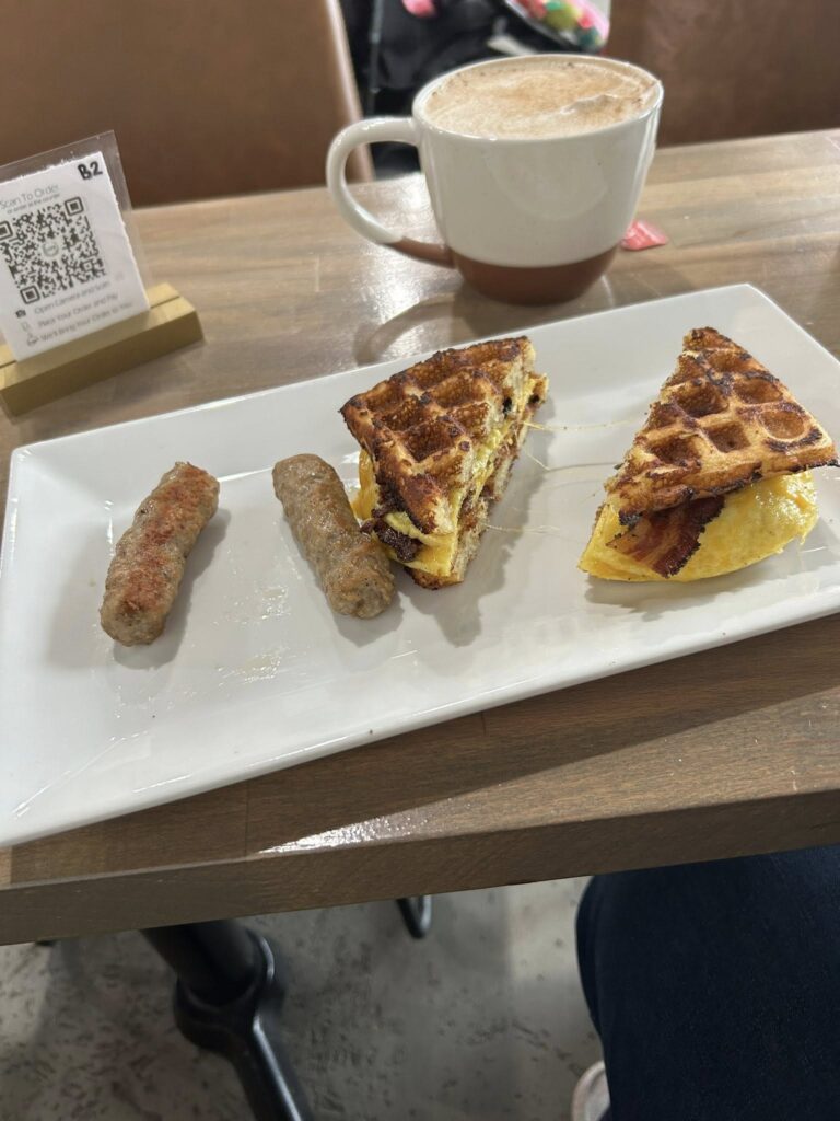 I was hungry since it was mid-morning, and I hadn’t eaten due to an early appointment. I perused the online menu, ordering from my table using their QR code, and opted for the Spicy Pesto Waffle Melt ($8). A crispy waffle envelops scrambled eggs, bacon, cheddar, mayo-pesto, and red pepper flakes. It had a nice spice level and came with a side of sausage links. The waffle was the perfect combination of fluffy and crisp on the outside and gave a little sweetness to the spice in the middle of the sandwich.