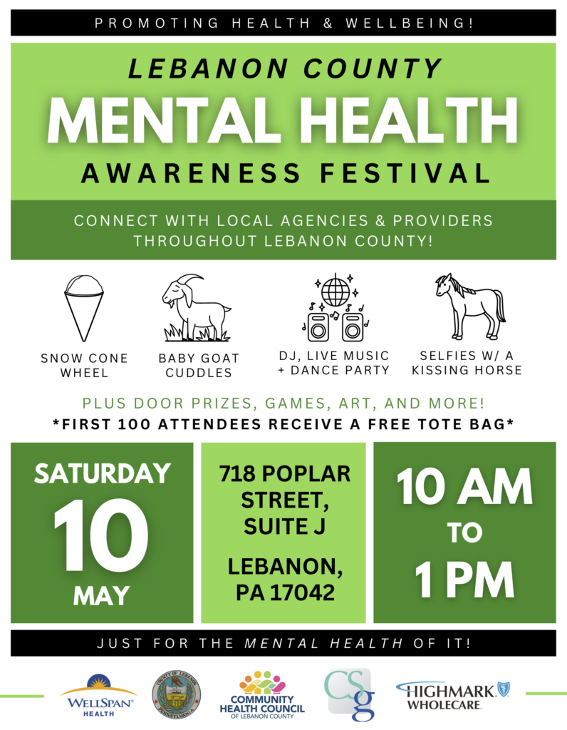 On Saturday, May 10, 2025, Lebanon County, in partnership with the Community Health Council and Community Services Group (CSG), will be hosting the third annual Mental Health Awareness Festival! The event will be held from 10 a.m. to 1 p.m. in the parking lot of the CSG Psychiatric Rehabilitation program, located at 718 Poplar Street in Lebanon (near the 8th St. Rail-Trail).