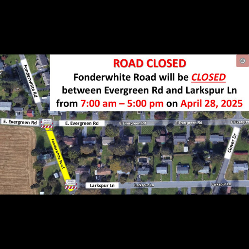 Road closure – Fonderwhite Road will be closed between Evergreen Road and Larkspur Lane on Monday, April 28, from 7 a.m. to 5 p.m. Allow extra travel time and plan routes accordingly.