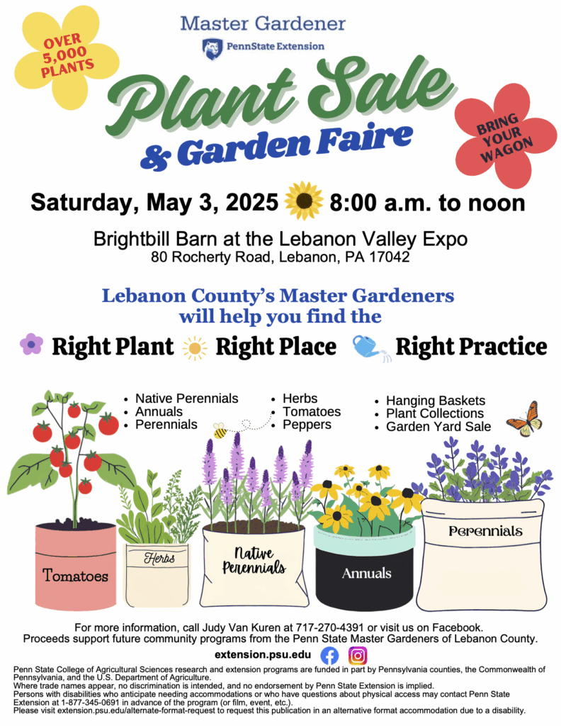 Gardeners, get ready! The Master Gardeners of Lebanon County are hosting their annual Plant Sale and Garden Faire on Saturday, May 3, 2025, from 8:00 a.m. to 12:00 p.m. at the Brightbill Barn. Find a wide selection of annuals, vegetables, perennials, native plants, herbs, tomatoes, peppers, and more — ideal for gardeners of all experience levels.