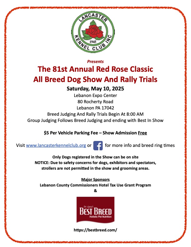 Attention dog lovers! The Lancaster Kennel Club presents the 81st Annual Red Rose Classic Dog Show on Saturday, May 10, 2025, from 7:00 a.m. to 7:00 p.m. at the Lebanon Valley Expo Center & Fairgrounds. Watch as top dogs compete in an exciting array of events including the All-Breed Show, two Rally Trials, Junior Showmanship, and special breed shows from the Cavalier Fanciers of the Susquehanna Valley, the Philadelphia Kerry Blue Terrier Club, and the Antietam Creek Samoyed Club.