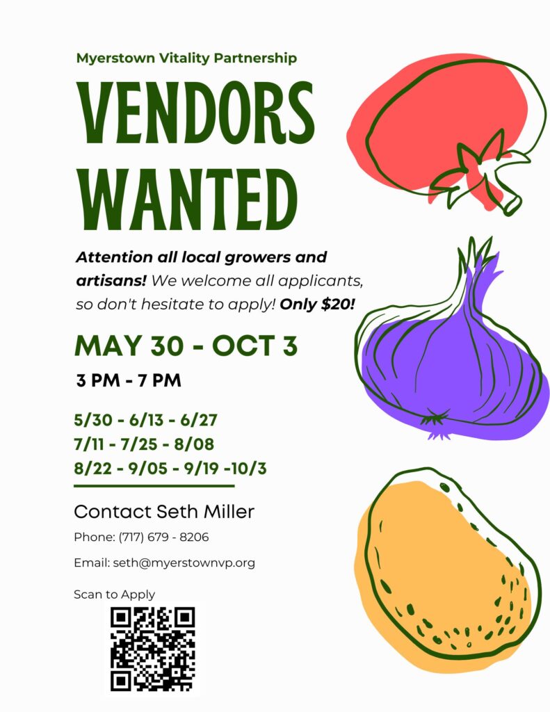 For any questions or additional information, please contact Seth Miller at seth@myerstownvp.org or (717) 679-8206. Stay up to date about the market by following the Myerstown Vitality Partnership on their social media pages Myerstown Vitality Partnership.