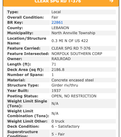The bridge, located in North Annville Township, is owned by Norfolk Southern, according to PennDOT’s bridge database. The bridge, 71 feet long and 31 feet wide, was built in 1937.