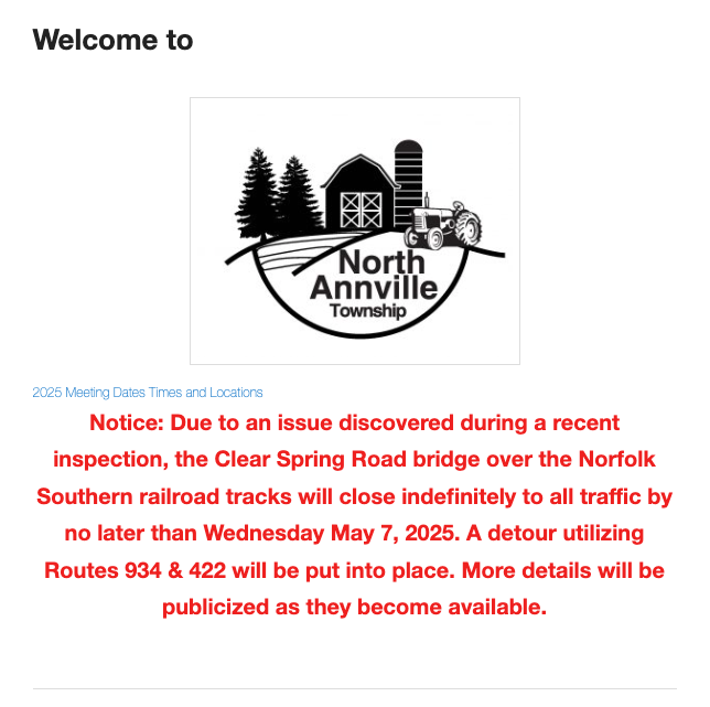 North Annville Township posted on its website Thursday that, “Due to an issue discovered during a recent inspection, the Clear Spring Road bridge over the Norfolk Southern railroad tracks will close indefinitely to all traffic by no later than Wednesday May 7, 2025.”