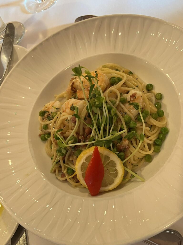 The spaghetti & shrimp comes with baby peas, egg, parmesan, carbonara. Six large shrimp adorn this dish. The carbonara sauce has that luscious, creamy texture—without a drop of cream. Baby peas bring a pop of color and a fresh, slightly sweet contrast to the savory richness. Every bite is a comforting blend of creamy, cheesy, and subtly briny goodness.