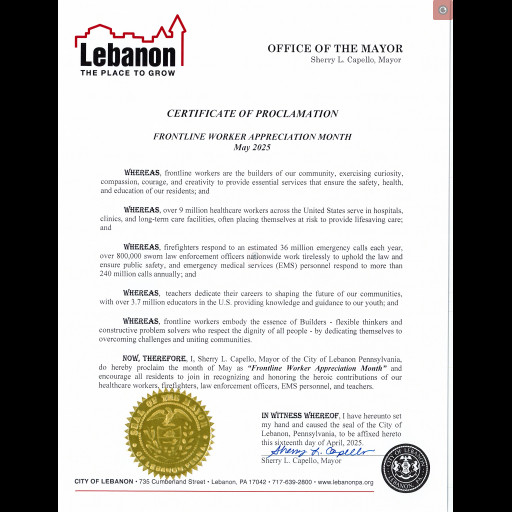 “Let’s all take time this month to thank a frontline worker, acknowledge their sacrifices, and celebrate the vital role they play in our lives,” stated the City of Lebanon, PA Government on Facebook.