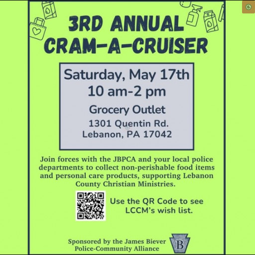 Third annual Cram-A-Cruiser – The James Biever Police-Community Alliance and local police departments are asking for donations of nonperishable food items and personal care products to support Lebanon County Christian Ministries. The event will take place from 10 a.m. to 2 p.m. Saturday, May 17, at the Grocery Outlet, 1301 Quentin Road, Lebanon. Visit the James Biever Police-Community Alliance for more information.