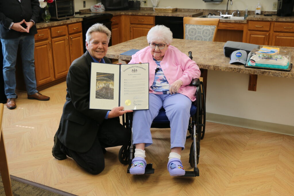 Rep. Russ Diamond (R-102) said he was happy to be there to help her celebrate her voting record. After noting he had presented her a citation marking her 100th birthday, he observed that the Crocs she was wearing had a miniature Croc on top of one of her shoes. Koons jokingly responded that her croc had had a baby.