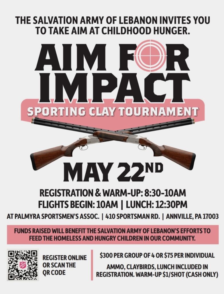 Aim For Impact is the new fundraiser for the Lebanon Corps of the Salvation Army that will help them “DO THE MOST GOOD” in our community. The event will be held on May 22, 2025, at the Palmyra Sportsman Association in Annville, PA.