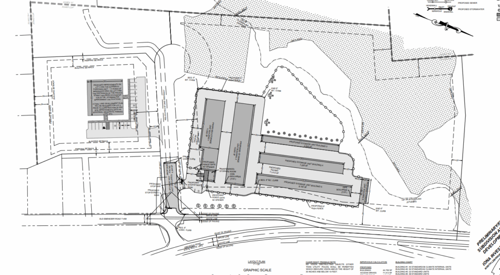 - Unanimously approved a preliminary/final plan for five storage unit buildings at 101 Old Ebenezer Road, by the split of State Route 72 into Old Ebenezer Road, as well as waivers for a preliminary plan and description of inverts of the existing sanitary sewer, as the plan does not include a sewer connection.