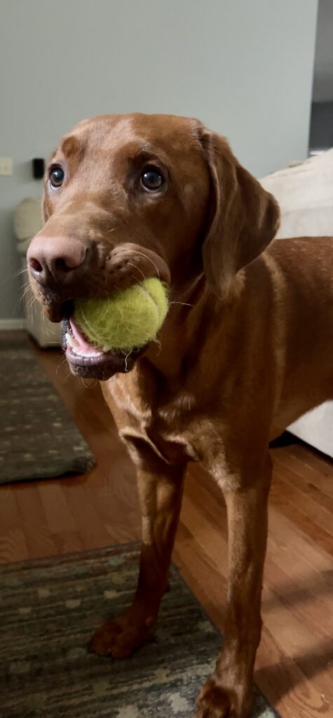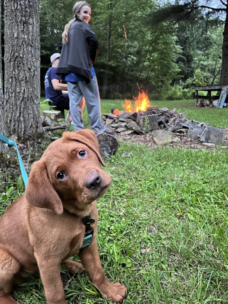 The young pup “absolutely loves playing outside with his frisbee and soccer ball,” she adds, and he “loves chewing up sticks and making a mess of the yard. He loves going to the family cabin and watching the boys fish. He enjoys car rides and visits to Lowes, Tractor Supply and PetSmart. He loves pup cups at DQ and Oola Bowls.”
