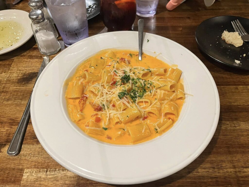 The rigatoni vodka came with sautéed fresh tomatoes, sun-dried tomatoes, and a vodka blush sauce. This dish came out piping hot and had a creamy base to the sauce. We added some extra cheese which made it a delectable bite. Once the temperature cooled down, the little critic and I were able to dig in and enjoyed our selection.