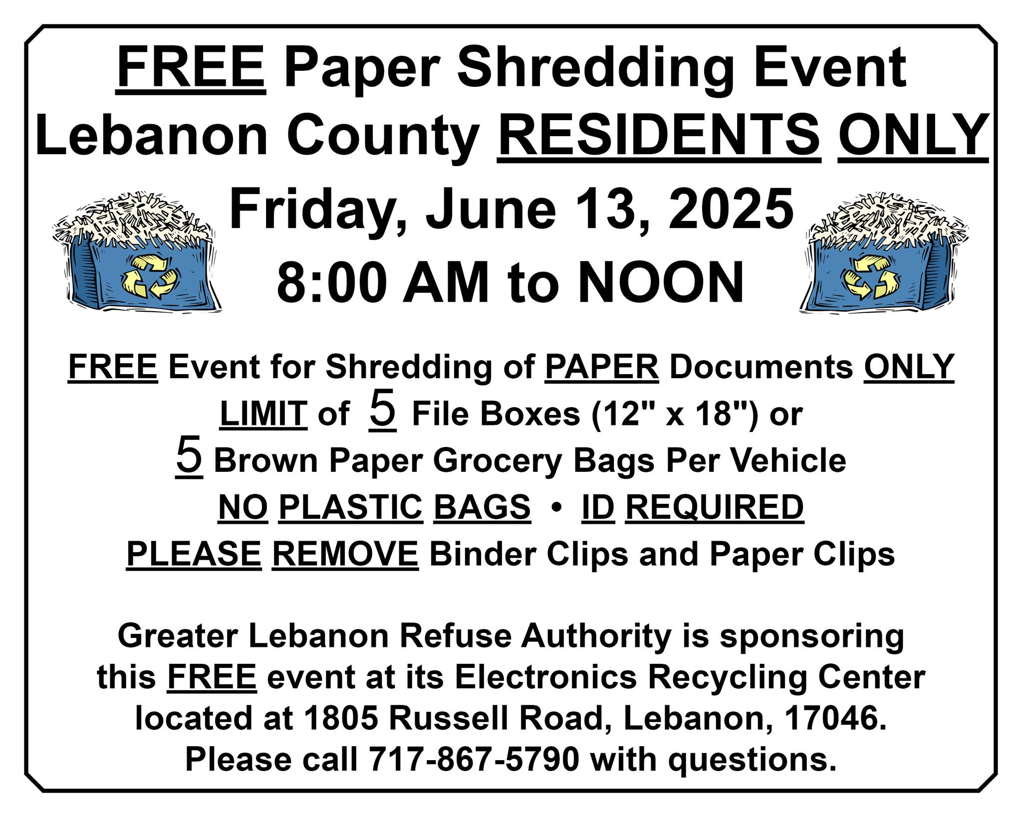 Mark your calendars! The ninth annual Lebanon County Paper Shredding Event will be held at Greater Lebanon Refuse Authority on Friday, June 13, 2025, from 8:00 a.m. to 12:00 p.m.